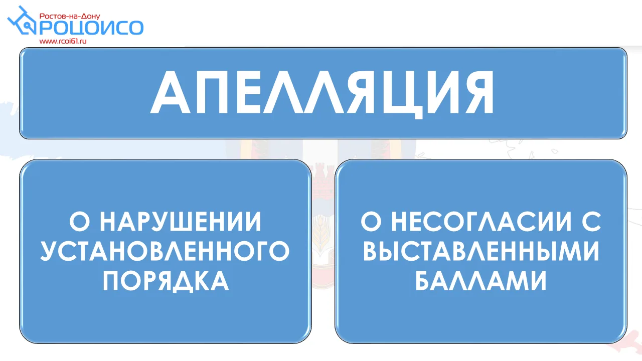 При проведении государственной итоговой аттестации по образовательным программам основного общего образования (далее – ГИА) в Ростовской области создается областная апелляционная комиссия и ее подкомиссии (далее – апелляционная комиссия), которые уполномочены разрешать спорные вопросы по оцениванию экзаменационной работы и по соблюдению требований процедуры проведения ГИА.
